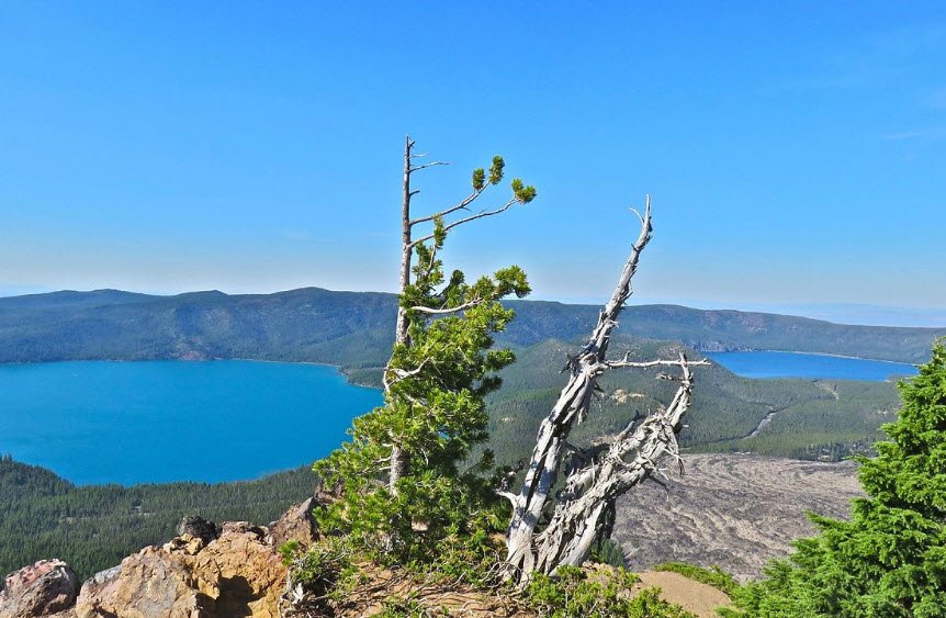 Newberry National Volcanic Monument south of Bend in central Oregon's Deschutes National Forest preserves over 54,000 acres of the Newberry Volcano's shield caldera and recent lava flows from about 1,300 years ago, offering stunning scenic overlooks like the summit of 7,984-foot Paulina Peak with 360-degree panoramas of twin crater lakes, Cascade peaks from Mt. Shasta to Mt. Rainier, and vast obsidian fields.