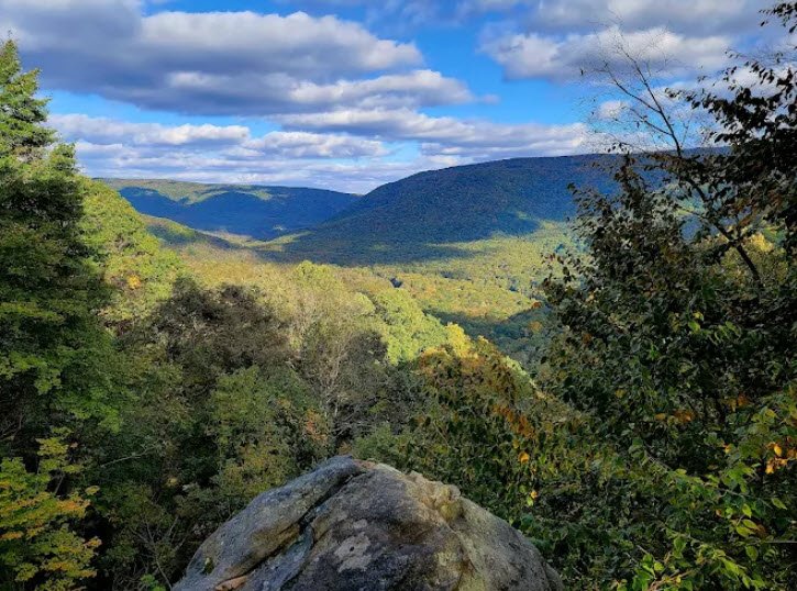 The park offers 79 miles of hiking trails including part of the Laurel Highlands Hiking Trail, mountain biking on the Great Allegheny Passage rail trail, hunting on 18,000 acres for deer, bear, turkey, and squirrels, and unique biodiversity at Ferncliff Peninsula National Natural Landmark.