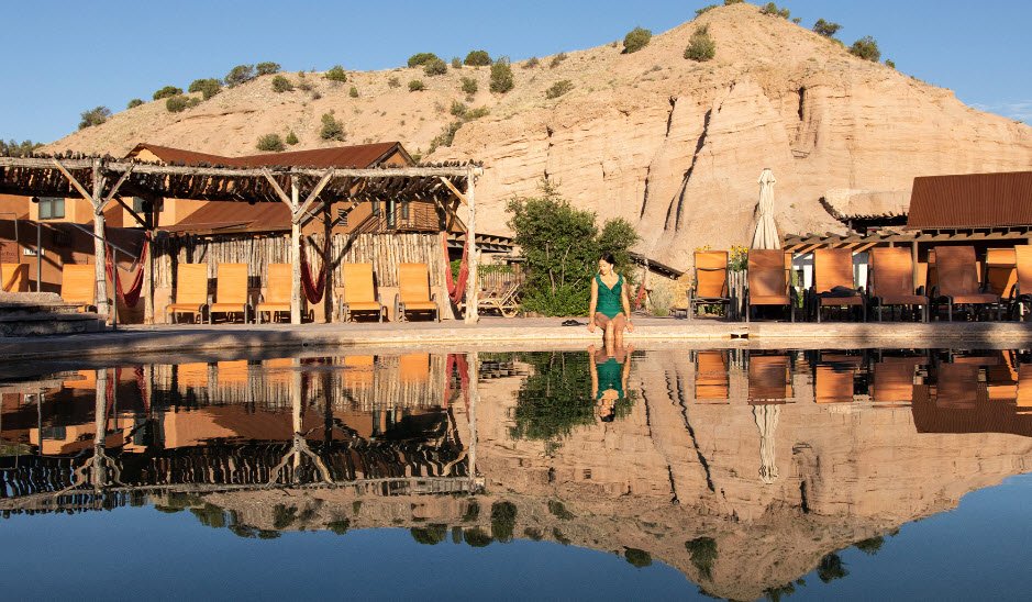 The resort is praised for its tranquil atmosphere, friendly staff, and scenic setting amid desert cliffs and a cottonwood-lined river. The historic hotel offers basic rooms with shared shower facilities, while newer suites provide private soaking pools and fireplaces, making it suitable for both relaxation and wellness retreats.