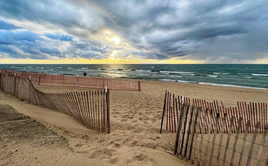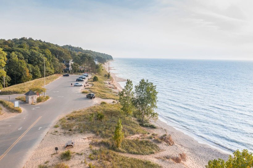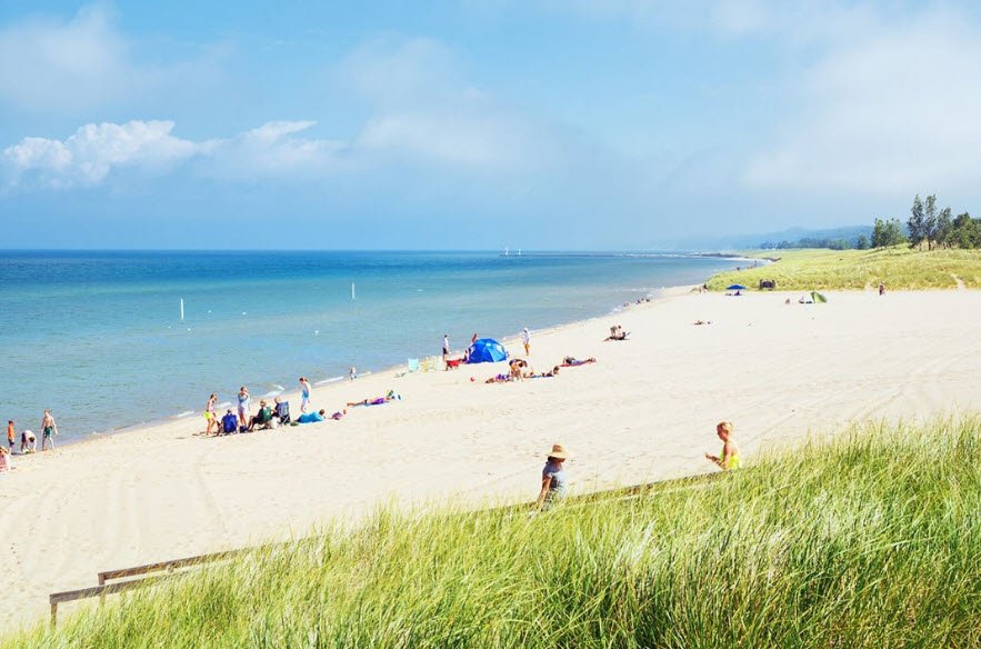 Oval Beach in Saugatuck, Michigan, is widely celebrated for its stunning natural beauty, featuring soft, pristine sands and clear, teal waters of Lake Michigan.