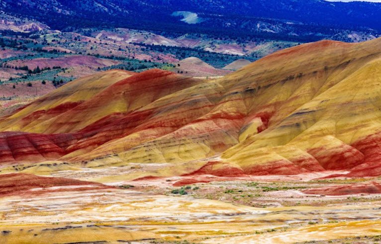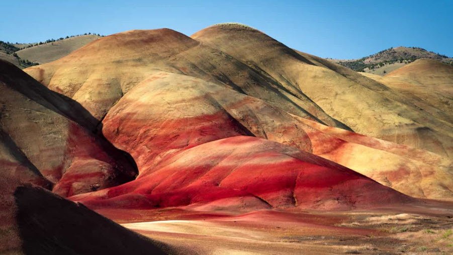 Painted Hills, a stunning geologic formation spanning 3,132 acres in Wheeler County about 9 miles northwest of Mitchell in north-central Oregon's high desert, forms one of three units of John Day Fossil Beds National Monument with vividly layered bands of red, yellow, gold, black, and gray mudstone, shale, siltstone, and lignite revealing 35-28 million years of climate shifts from Eocene tropical wetlands to cooler Oligocene dryness.