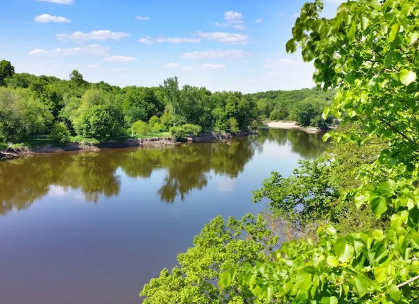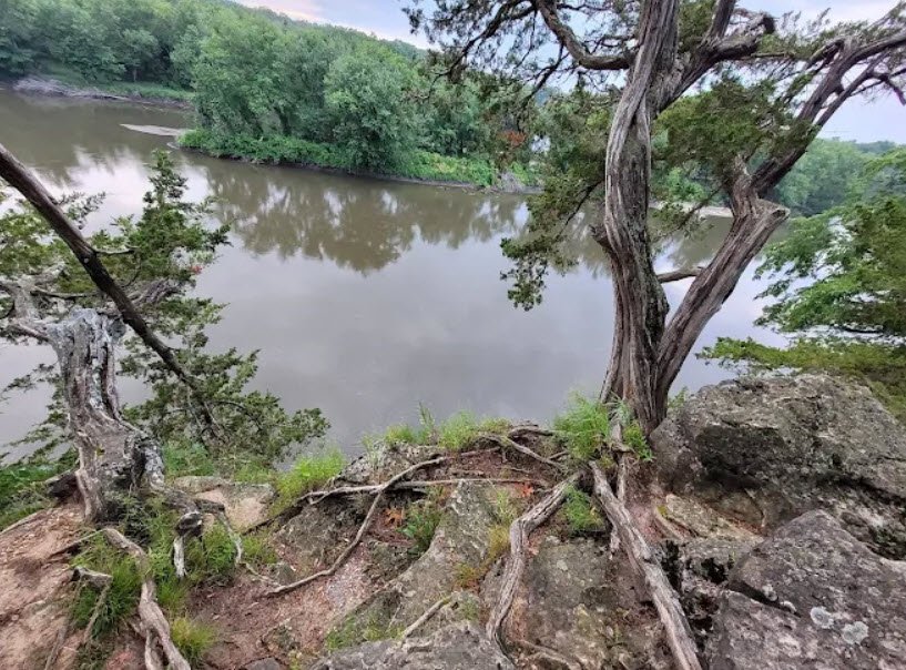 Visitors explore 3.5 miles of hiking trails for rock climbing, fish bass, catfish, and walleye from river access, swim at the beach, camp at 45 sites with electric hookups, or rent cabins and the CCC lodge for day use.
