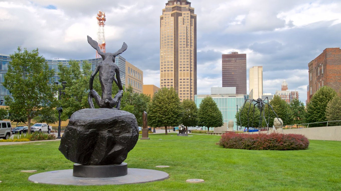 The park opened in 2009 as part of a downtown revitalization effort, transforming a rundown industrial area into a vibrant cultural destination. The sculptures, valued at around $40 million, were originally displayed on the Pappajohns' private lawn before being relocated to the park. Designed with grassy mounds and parabolic cutouts, the landscape provides distinct spaces to showcase various artistic styles, from realistic human and animal forms to abstract and minimalist works by renowned artists like Louise Bourgeois and Ai Weiwei.
