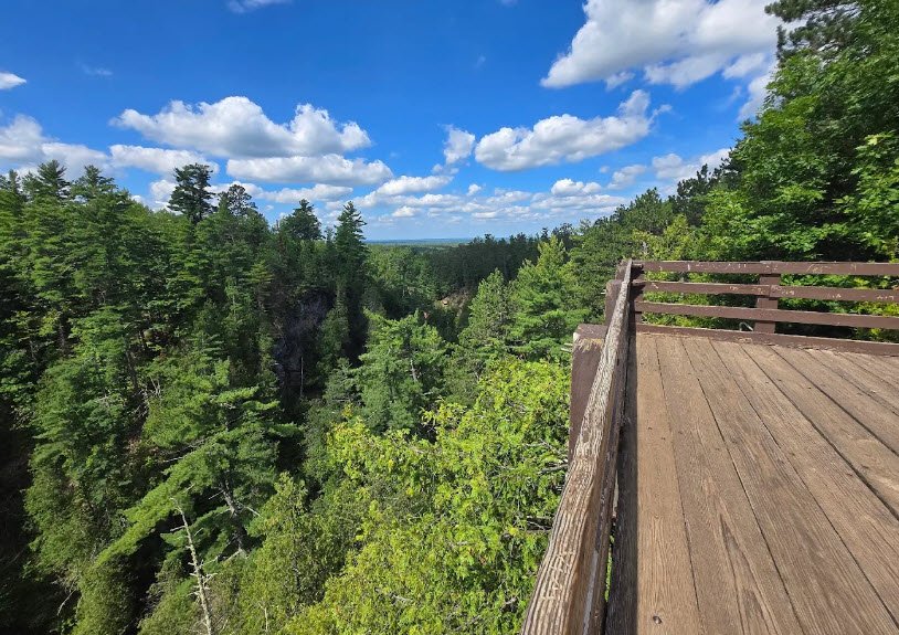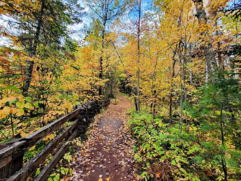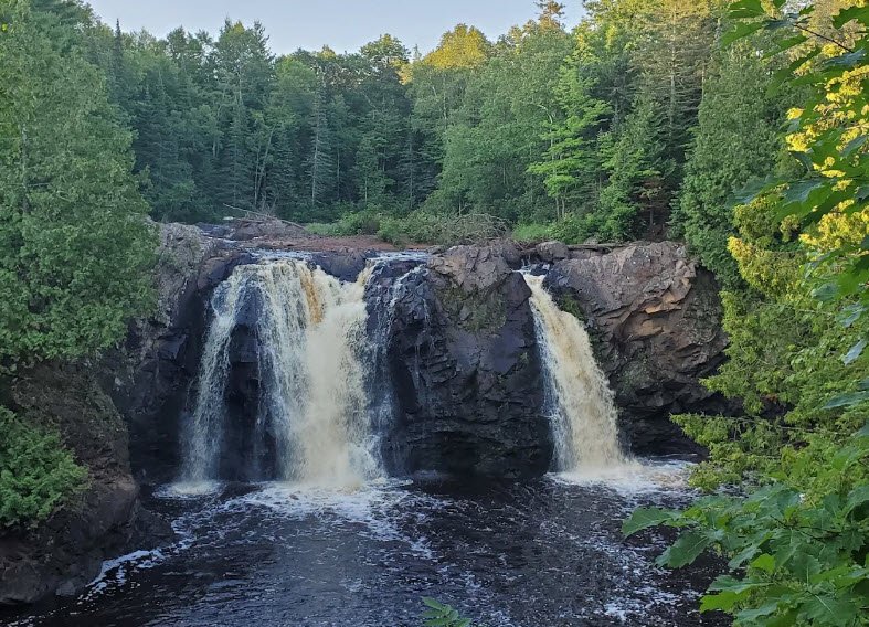 Established in 1920 and managed by the Wisconsin DNR, its 1,476 acres of balsam fir, birch, aspen, spruce forests, wetlands, and Interfalls Lake support nearly 200 bird species, 54 mammals, and diverse reptiles amid nine miles of scenic hiking trails, a 300-foot sandy beach for swimming, a nature center, picnicking, and 62 campsites including backpack, RV, tent, and electric options. Winter activities feature groomed cross-country skiing, snowshoeing on hilly wooded paths, with accessible paved trails to major falls overlooks.