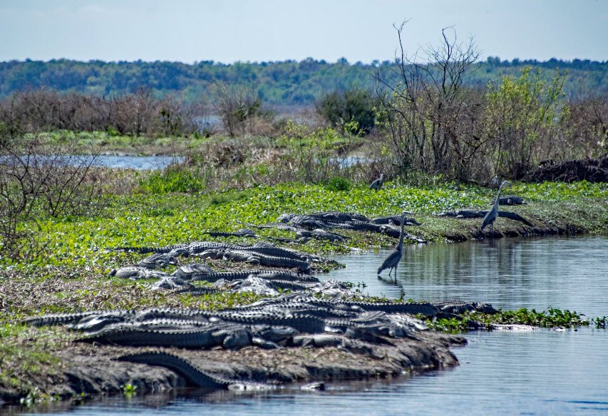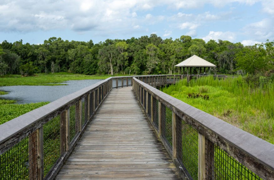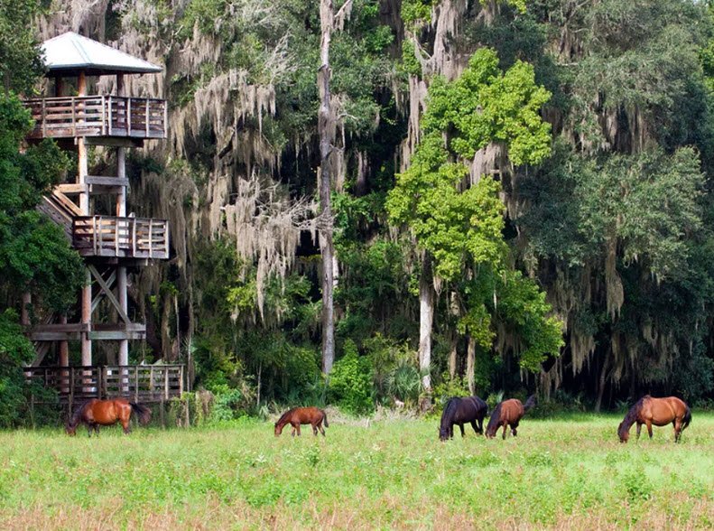 Home to wild bison and horses roaming freely alongside alligators, deer, turkeys, and nearly 300 bird species like sandhill cranes and bald eagles, it offers eight trails for hiking, biking, and horseback riding—including the 16-mile paved Gainesville-Hawthorne State Trail—plus a 50-foot observation tower, Lake Wauburg for canoeing and fishing.
