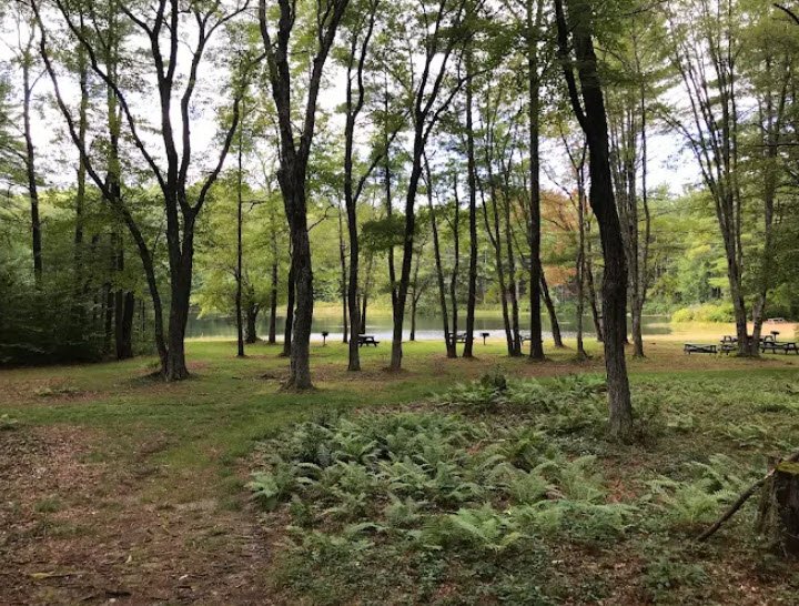 The park features a quiet woodland setting with tall pines and several small ponds, including a 5‑acre pond that offers swimming and fishing, along with picnic areas and ample opportunities for hiking, mountain biking, horseback riding, and cross‑country skiing on a network of trails.