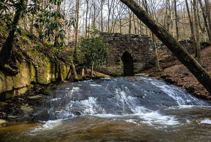 The bridge spans 130 feet over Little Gap Creek and features a distinctive 14-foot high Gothic arch, made from locally quarried stone without mortar, a remarkable engineering achievement for its time.