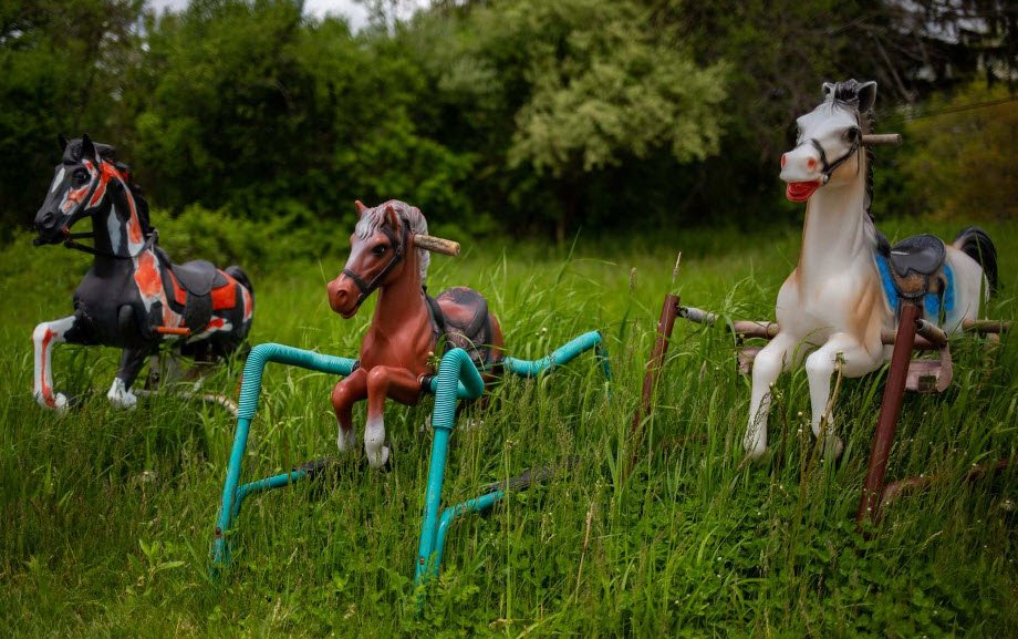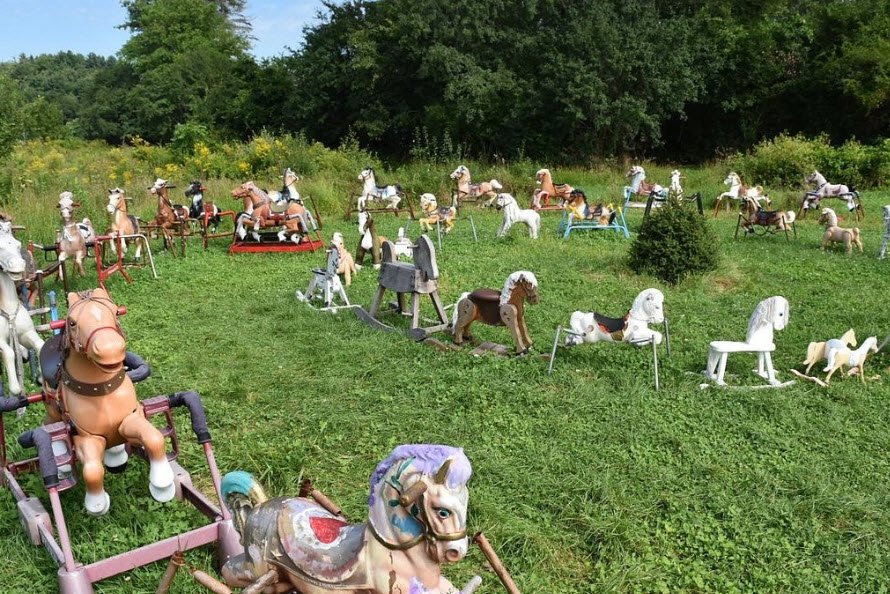 The origin of Ponyhenge is uncertain, but it is believed to have started around 2010 when a discarded Halloween prop, a headless horse, was left in a field by the landowners, Jimmy Pingeon and Elizabeth Graver. Since then, the collection has grown with horses of different shapes, sizes, materials, and colors, creating a sort of ever-changing, unofficial folk art installation that delights visitors.