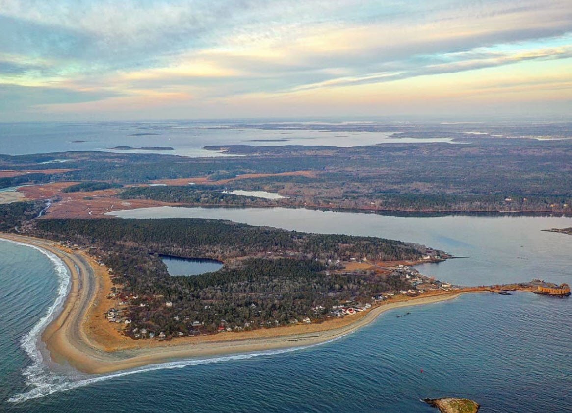 Popham Beach State Park in Maine is a rare and scenic geological landform featuring a long sandy beach bordering the south side of the Kennebec River mouth.