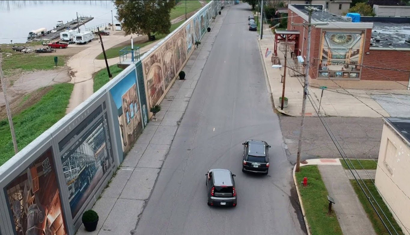 The Portsmouth Floodwall Mural in Kentucky is an impressive outdoor art gallery that stretches for over 2,000 feet along Front Street in Portsmouth, depicting the city’s last two centuries of history and life in the region.