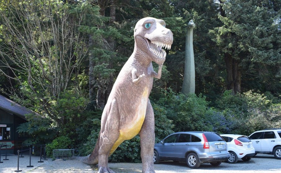 Visitors follow a self-guided trail past giants like an 86-foot Brachiosaurus peering over fences, a towering Tyrannosaurus at the entrance, and others with informative signs on anatomy, the Mesozoic Era, and local plants, blending education with photogenic wonder despite no real dinosaurs ever living in Oregon's ancient ocean-covered landscape.