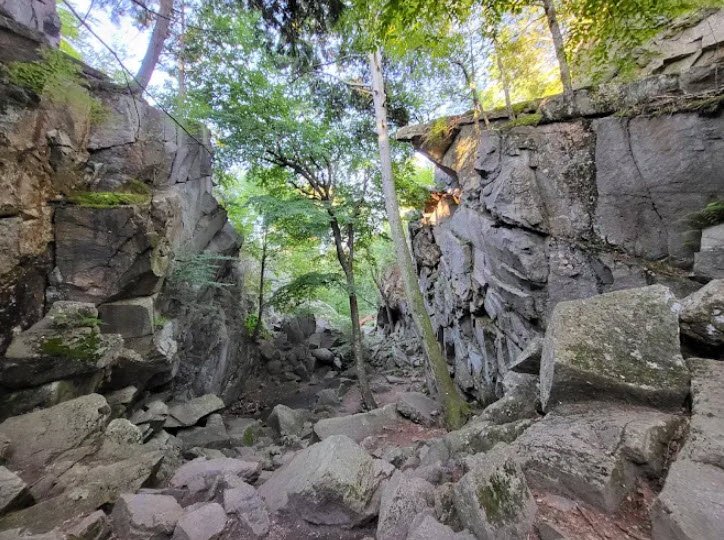Managed by the Massachusetts Department of Conservation and Recreation since 1919, it features 2 miles of hiking trails like Charley's Loop and the Purgatory Chasm Loop for rock scrambling past unique formations such as The Corn Crib, The Coffin, and Lovers' Leap, plus picnic areas, a playground, visitor center, and seasonal rock climbing by permit.