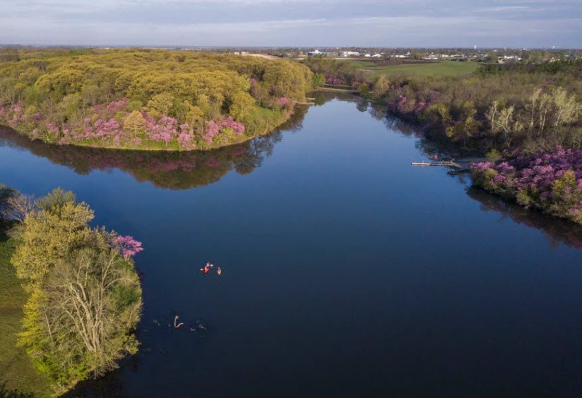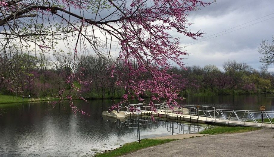 Red Haw State Park covers 649 acres near Chariton in Lucas County, south-central Iowa, USA, established in 1935 around a scenic 72-acre lake renowned for abundant springtime redbud blooms creating pink landscapes that draw photographers.
