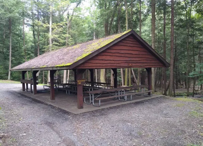 Honey Creek flows through the park beneath large hemlock and white pine trees, offering trout fishing, picnicking at pavilions, a playground, rustic camping, and three miles of hiking trails including parts of the Mid-State Trail amid rocky gaps and forested mountains.