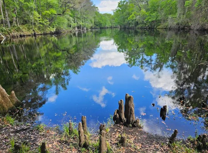 River Rise Preserve State Park, located six miles north of High Springs off U.S. Route 441 in Florida, is named for the dramatic spot where the Santa Fe River resurfaces after flowing underground for miles through adjacent O'Leno State Park.