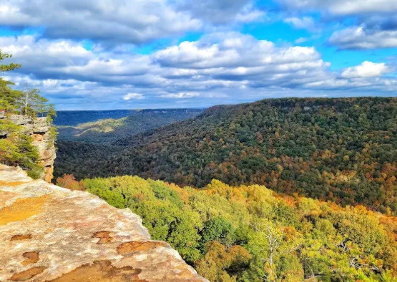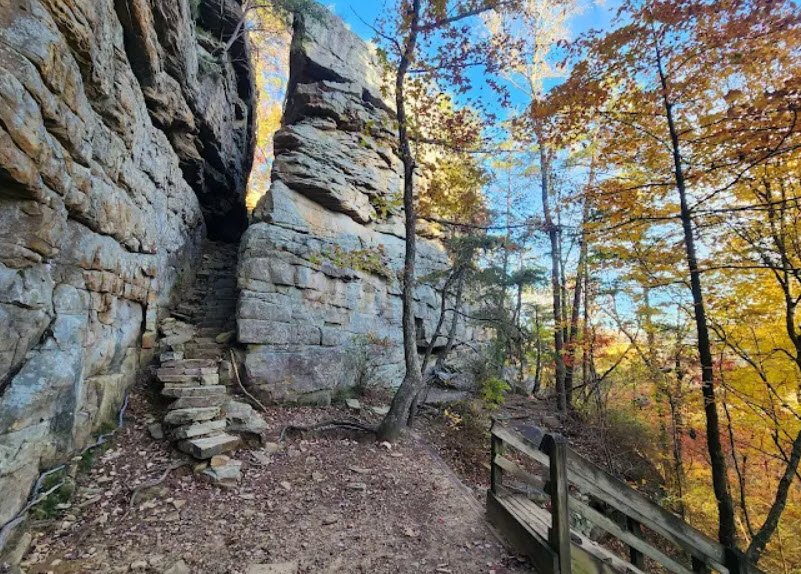 It features over 50 miles of hiking trails leading to stunning vistas, numerous waterfalls, swimming holes, and landmarks like the Great Stone Door—a 10-by-100-foot crack in the cliff resembling an ajar door that offers access to the gulf below. Visitors enjoy backcountry camping at nine sites, picnicking, and rock climbing on permitted routes, with four trailhead parking areas providing access, though future developments like a visitor center and RV campground are planned.