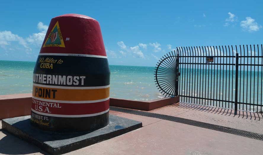 The Southernmost Point of the continental U.S.A., located in Key West, Florida, is marked by a large painted concrete buoy erected in 1983 by the city to replace earlier wooden signs that were frequently stolen.