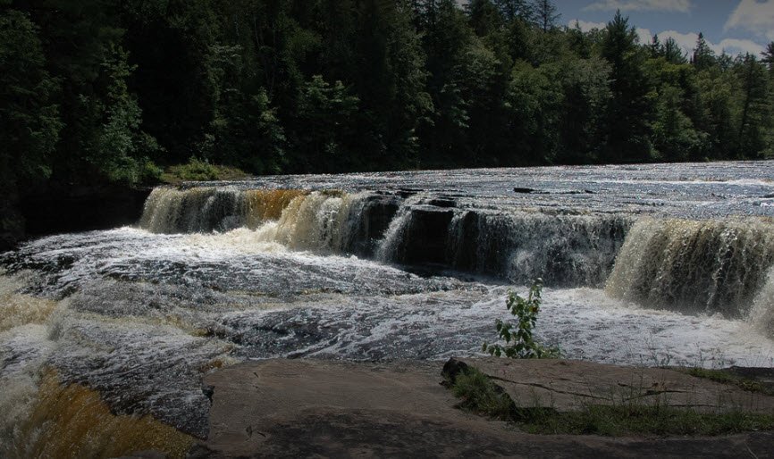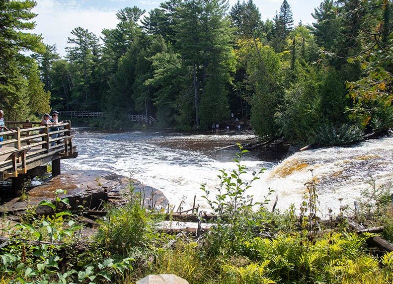 The park is famous for the Upper Falls, which is over 200 feet wide and has a 50-foot drop, making it one of the largest waterfalls east of the Mississippi River. Its water has a unique amber color from tannins in nearby cedar and hemlock swamps, earning it the nickname "Root Beer Falls." Downriver, the Lower Falls feature a series of smaller cascades around an island accessible by a bridge or rowboat.