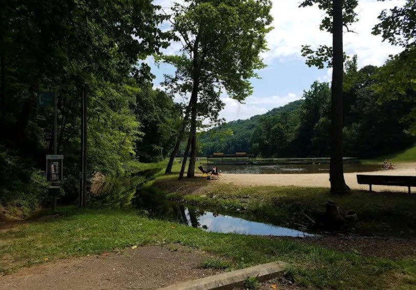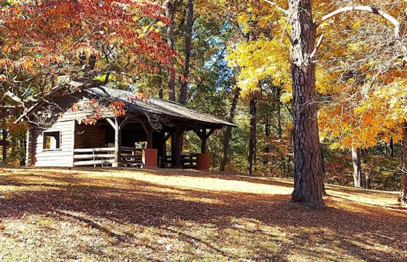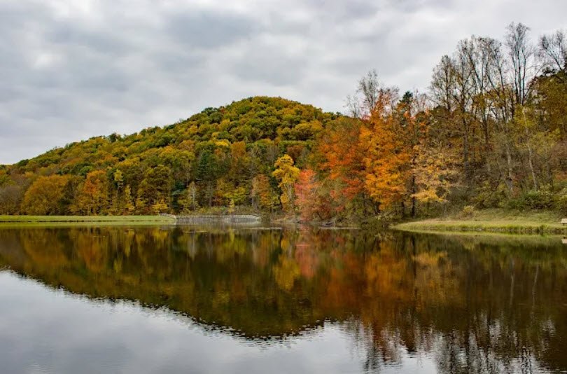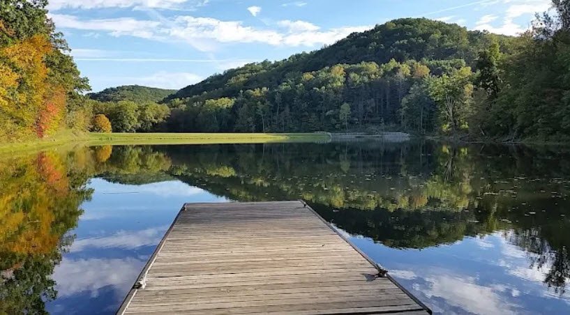The park features the 15-acre Pine Lake for boating, fishing, and swimming, moderate to difficult hiking trails extending into the forest, hunting for deer, turkey, and grouse, a campground, picnic areas with shelters, and vibrant spring wildflowers plus spectacular fall foliage, all developed in the 1930s by New Deal programs like the WPA.