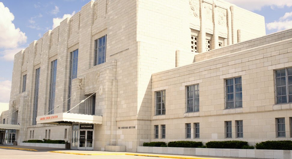 The Durham Museum in Omaha, Nebraska, is located in the historic Union Station building, a National Historic Landmark known for its stunning Art Deco architecture.