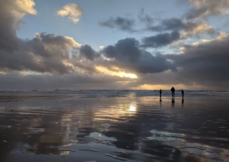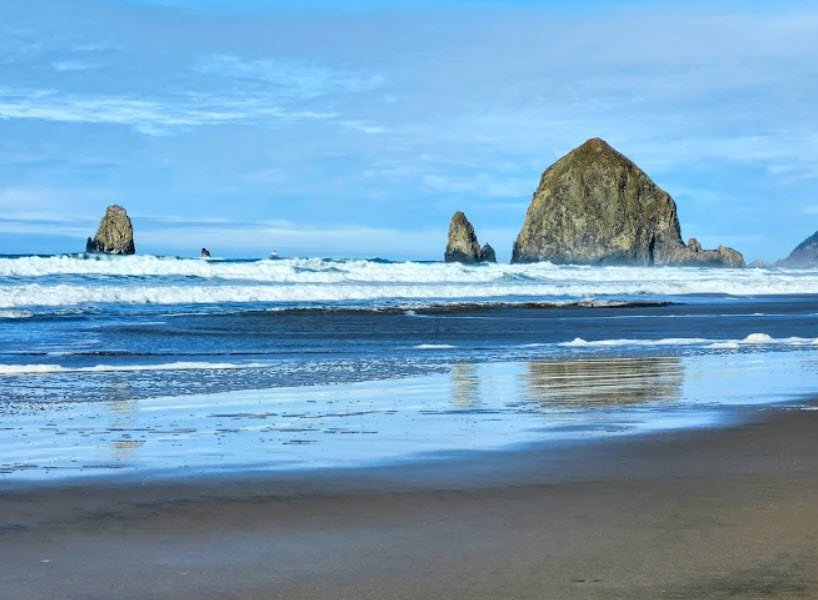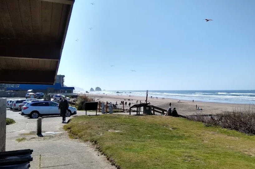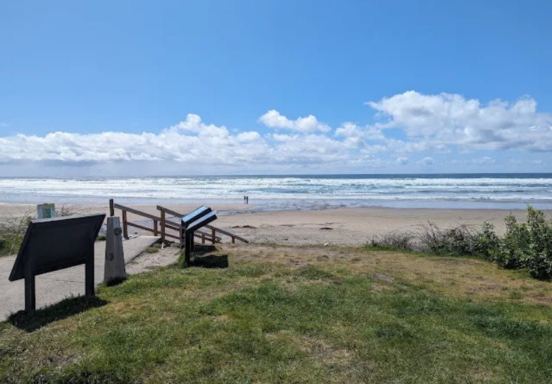 Just under a mile south of the iconic 235-foot Haystack Rock—a basalt sea stack teeming with tidepool life and nesting seabirds like tufted puffins—it provides direct beach entry via stairs or ramps, a playground, picnic tables, open grassy fields for kite flying or games, restrooms, and scenic spots for sandcastle building, sunset viewing, and whale watching.