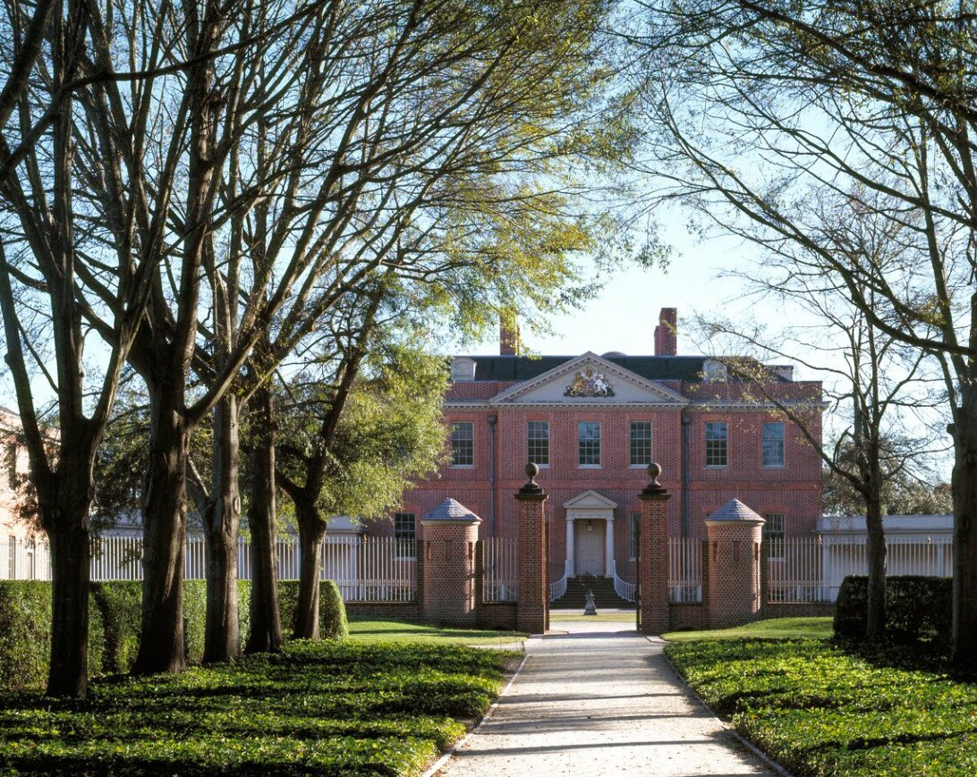 Tryon Palace in New Bern, North Carolina, is a meticulously reconstructed Georgian-style mansion that originally served as the British colonial governor's residence and North Carolina's first capitol from 1770 until the American Revolution, designed by architect John Hawks at the behest of Governor William Tryon amid controversy over its lavish £15,000 cost that fueled backcountry unrest like the War of the Regulation.