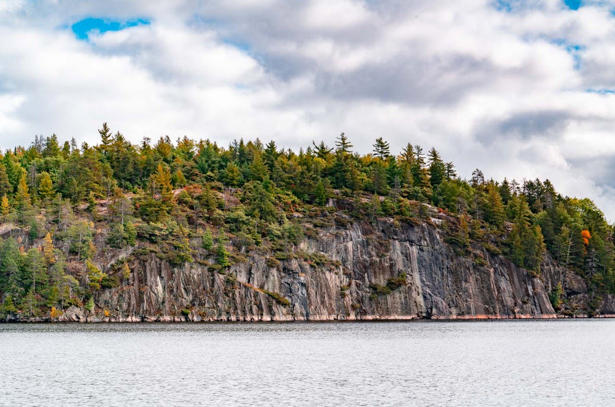The park's landscape features northern hardwood and boreal forests, rocky shorelines on the Canadian Shield, and diverse wildlife including bald eagles, gray wolves, moose, and over 240 bird species. Unique park attractions include ancient Native American petroglyphs, several waterfalls, hiking trails, and popular stargazing spots recognized for their dark skies. Activities include boating, kayaking, fishing, wildlife viewing, camping, and in winter, snowmobiling, skiing, and snowshoeing.