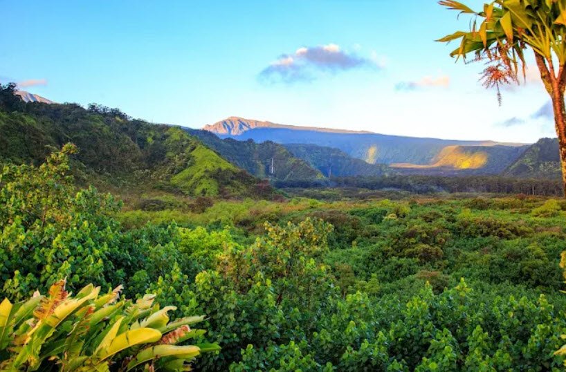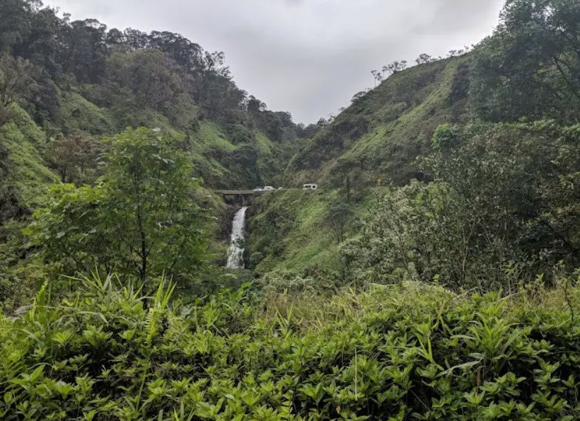 Wailua Valley State Wayside Park is a small roadside overlook tucked into Maui's cliffs just past mile marker 19 on the Road to Hana in Hawaii, USA, offering quick panoramic views of the lush Keʻanae Valley and distant waterfalls.