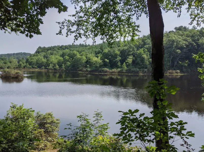 It offers two reservable picnic shelters with grills and electrical outlets overlooking the dam and lake, a three-acre athletic field for sports or kite flying, shaded picnic cove, canoe and kayak launches into the slow-current river, fishing spots, restrooms, and ample parking near Route 20 and the Mass Pike.