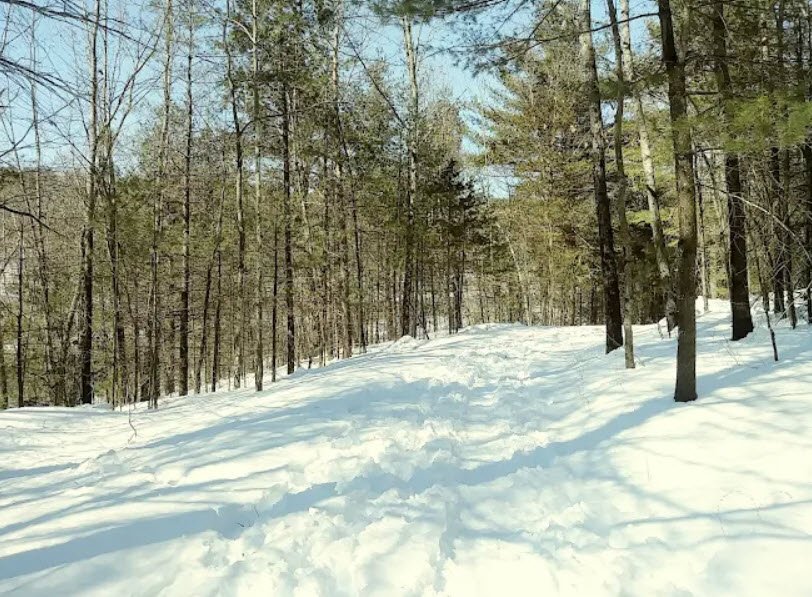 Trails include a 1.8-mile recreation loop around the site, access to the 4-mile Grand Trunk Trail for hiking and walking, plus winter ice skating on a pond and sledding hills amid scenic fields, woods, and waterside wildlife viewing.