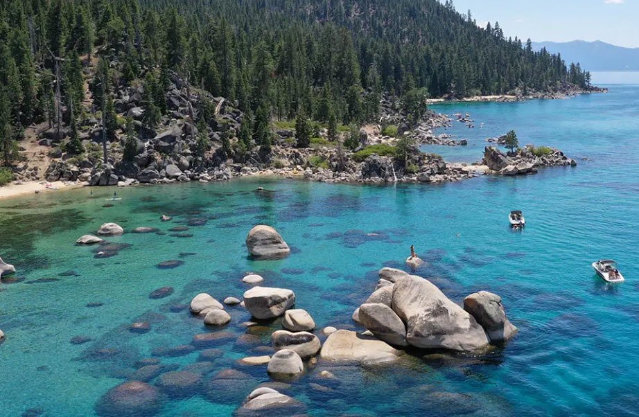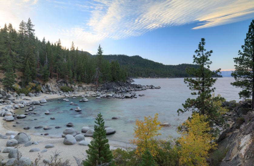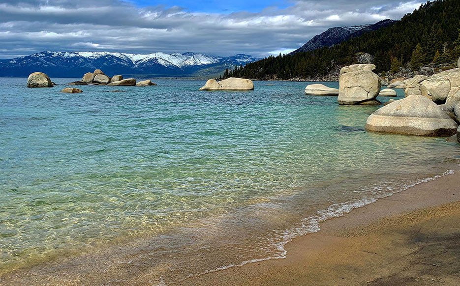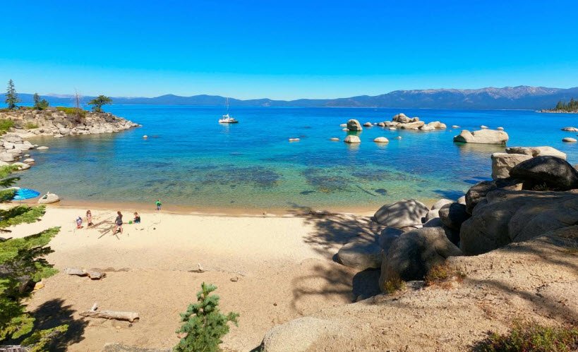 Whale Beach in Nevada is a scenic, secluded beach located on the eastern shore of Lake Tahoe, accessible via a hiking trail from the Secret Harbor Parking area off Highway 28. The beach gets its name from a distinctive rock formation in the bay resembling a whale, and it is also referred to as Black Sand Beach due to the dark-colored sand.