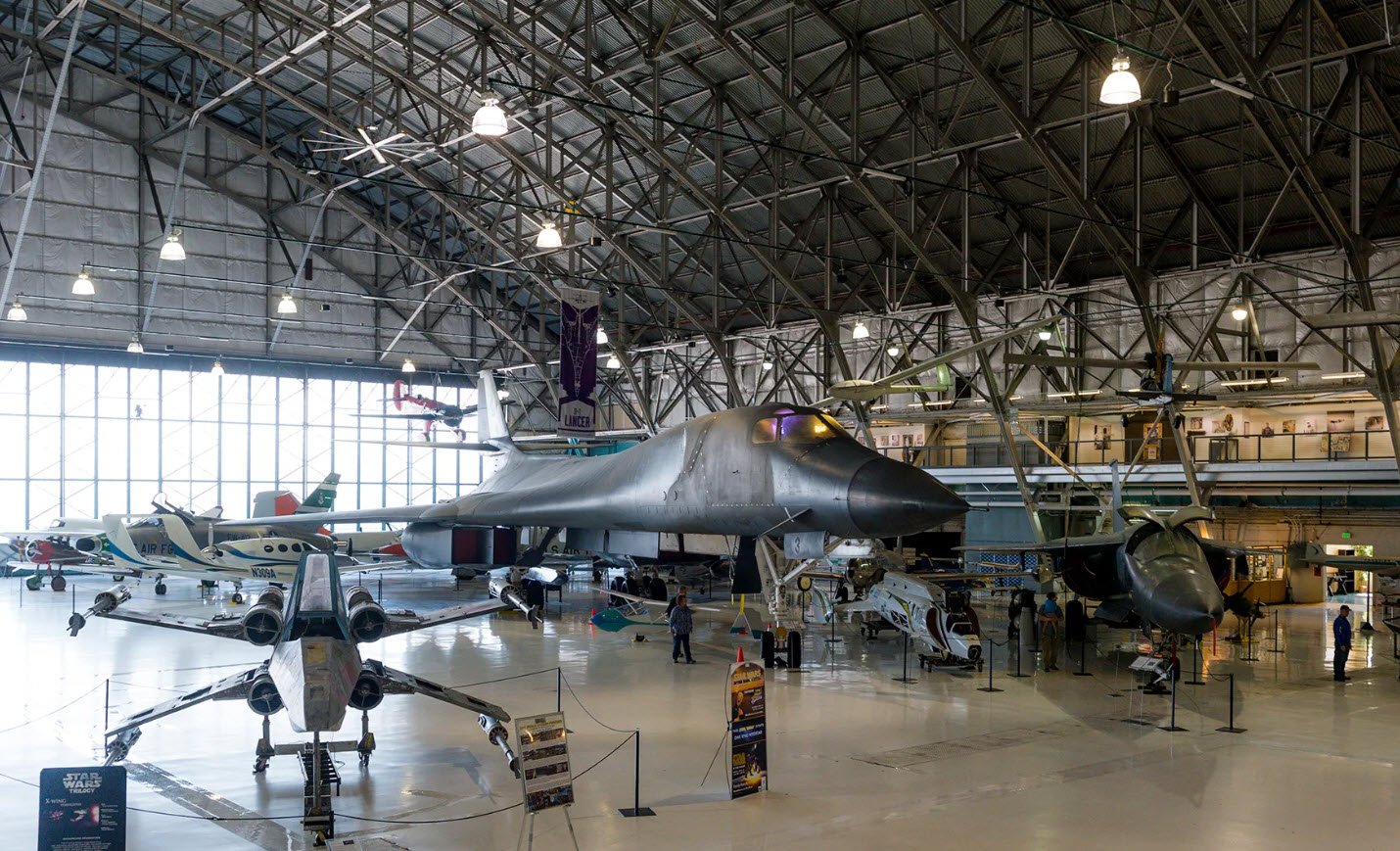 Highlights include a Boeing B-52 Stratofortress displayed at the entrance and a rare Rockwell B-1A Lancer bomber. The museum emphasizes aviation and space history with interactive exhibits, flight simulators, educational programs, and special events. It also operates a second location, Exploration of Flight, focusing on aviation education.