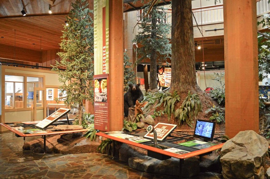 Guests can explore interactive exhibits on forest ecosystems, sustainability, and the connection between people and trees, including a bird's-eye view of northwest forests and hands-on displays such as operating forest machinery simulators and discovering wildlife beneath the forest floor.