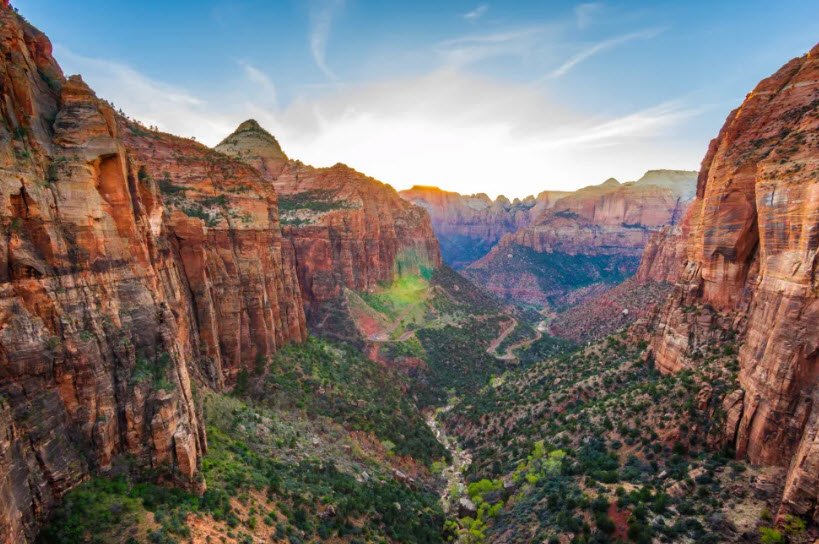 It covers approximately 229 square miles and is known for its dramatic red rock formations, deep canyons, and diverse ecosystems that include desert landscapes as well as high-altitude forests. Zion Canyon, a major feature of the park, stretches about 15 miles long and reaches depths of nearly 3,000 feet, showcasing stunning Navajo sandstone cliffs carved by the Virgin River.