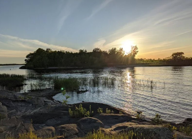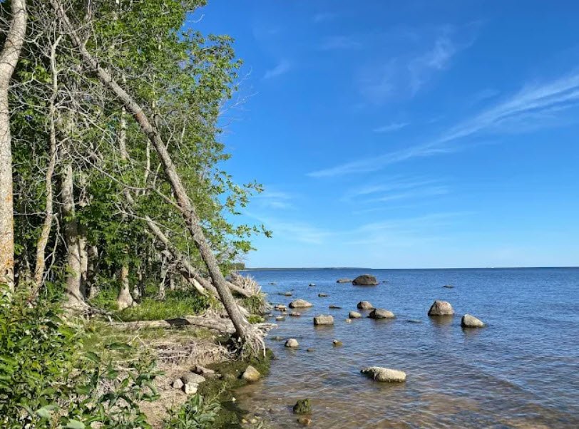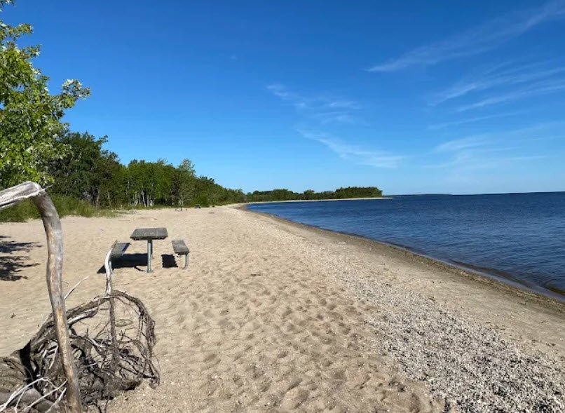 Formed from ancient Glacial Lake Agassiz remnants amid jack pine, birch forests, peatlands, and rock outcrops, it offers a marina with floating docks, concrete boat ramp, stone jetties for fishing walleye and pike, a swimming beach, 58 wooded campsites including group options, and trails for hiking, birdwatching sandhill cranes and piping plovers, berry picking wild blueberries, and orchid viewing.